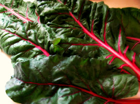 I have come to believe that Swiss chard is the perfect leafy green for me. I don't know how it tastes grown in other climates- as I've only had locally grown chard- but to me it's milder than spinach when steamed, has stalks that can be used in place of celery, and is a dream eaten raw. I've been chopping it into omelets, dips and salads, and sauteing the brilliant red and yellow stems into chicken salad, chicken and dressing and soups.